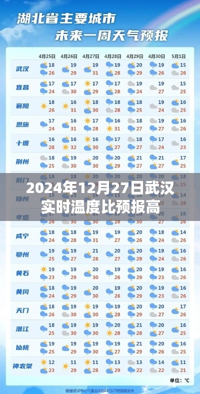 随着冬季的脚步逐渐临近,气温的变化成为了人们关注的焦点,特别是在寒冷的季节里,天气的变化往往影响着人们的日常生活和工作安排,在这样一个背景下,我们迎来了一个特殊的日子——2024年12月27日,这一天,武汉的实时温度比预报的温度要高,给市民带来了意外的惊喜。