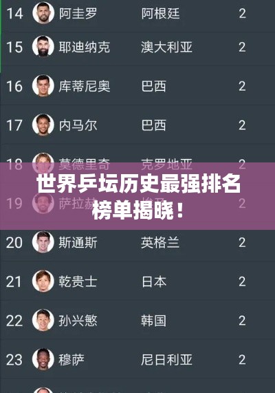 乒乓球作为中国的国球,历来备受关注,在世界乒坛的历史长河中,众多优秀的乒乓球选手涌现出来,他们凭借出色的技艺和不懈的努力,赢得了无数荣誉和粉丝的热爱,谁是世界乒坛历史上最强的选手呢?我们将根据各项数据和荣誉,为大家揭晓世界乒坛历史最强排名。