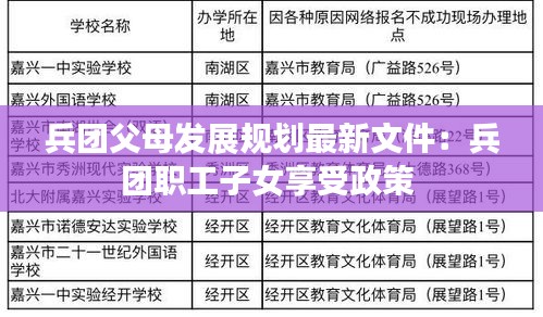 随着我国社会经济的快速发展和城镇化进程的加快,兵团作为国家重要的战略屏障和经济社会发展的重要力量,其父母发展规划显得尤为重要。为深入贯彻落实党中央、国务院关于兵团改革发展的决策部署,推动兵团父母工作迈上新台阶,近日,兵团发布了最新的父母发展规划文件。该文件旨在全面提升父母素质,优化家庭教育环境,为兵团的长远发展提供坚实的人才保障。