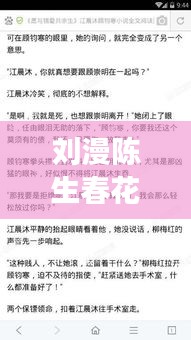 刘漫陈生春花是一部现代言情小说,讲述了主角刘漫与陈生、春花之间的爱恨情仇。小说以都市为背景,描绘了主人公们在爱情、友情、事业等多方面的纠葛。刘漫,一个聪明、独立的女主角,面对爱情总是充满热情却又不失理智;陈生,一个事业有成的霸道总裁,对刘漫有着复杂的情感;春花,刘漫的闺蜜,性格开朗,是刘漫生活中的重要支持者。