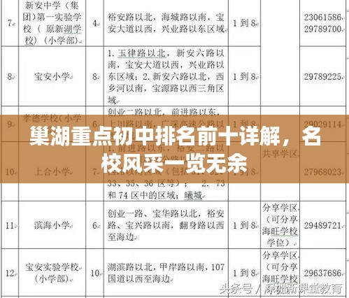 巢湖市作为安徽省的重要城市,其教育事业一直备受关注,本文将详细介绍巢湖市重点初中前十名的排名情况,让读者了解这些学校的实力和特色。