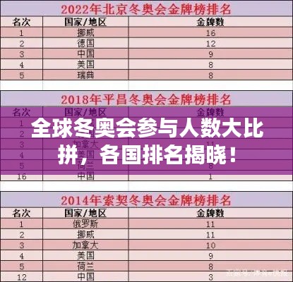 随着冬季奥林匹克运动会的日益普及和全球冰雪运动的蓬勃发展,越来越多的人参与到这项激动人心的体育盛事中,全世界冬奥会人数排名成为了衡量各国冬季运动发展水平的重要指标之一,本文将对全球参与冬奥会人数进行排名,探讨各国在冰雪运动领域的实力和影响力。
