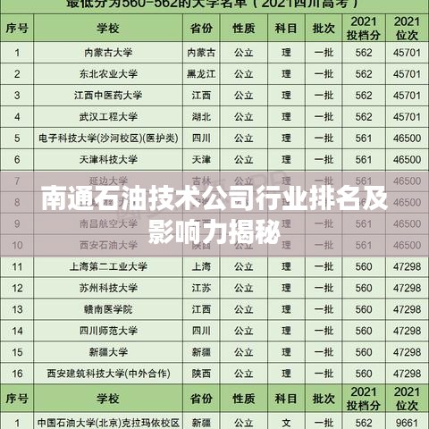 随着全球能源市场的不断发展和变化,石油行业在中国乃至全球范围内都扮演着举足轻重的角色,南通市作为中国重要的石油产业城市之一,拥有众多的石油技术公司,它们在国内外市场上展现出了强大的竞争力,本文将探讨南通石油技术公司的排名及其行业影响力。