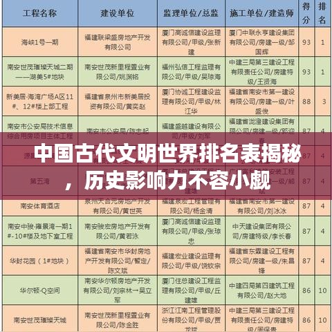 中国古代文明,作为东方文明的璀璨明珠,对世界文明的发展产生了深远影响,关于中国古代文明的世界排名,历史上并没有一个固定的标准,通过对其历史贡献、科技发展、文化成就等方面的考察,我们可以大致描绘出中国古代文明在世界上的地位,本文将从多个角度探讨中国古代文明的排名及其对世界的影响。