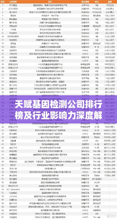 随着科技的不断进步,基因检测领域日益繁荣,在众多基因检测公司中,专注于天赋基因检测的公司在行业内崭露头角,本文将探讨天赋基因检测公司的排名及其行业影响力,为读者提供全面的视角。