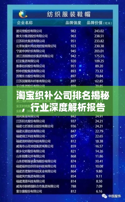 随着网络技术的飞速发展和电子商务的繁荣,淘宝作为国内最大的电商平台之一,拥有众多专业店铺,其中织补公司便是其中的重要一环,本文将围绕“淘宝织补公司排名”这一主题,对淘宝上的织补公司进行深度解析,带您了解这个行业的前沿动态和各大店铺的优劣。