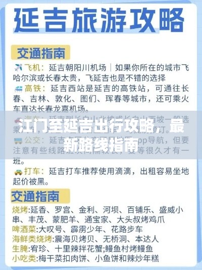 如果您计划从江门出发前往延吉,那么这篇路线攻略将为您提供最新的信息和建议,帮助您顺利完成旅程,本攻略将涵盖从江门出发的路线、交通工具选择、沿途景点推荐以及旅行注意事项等方面的内容,为您的旅行提供全方位的帮助。