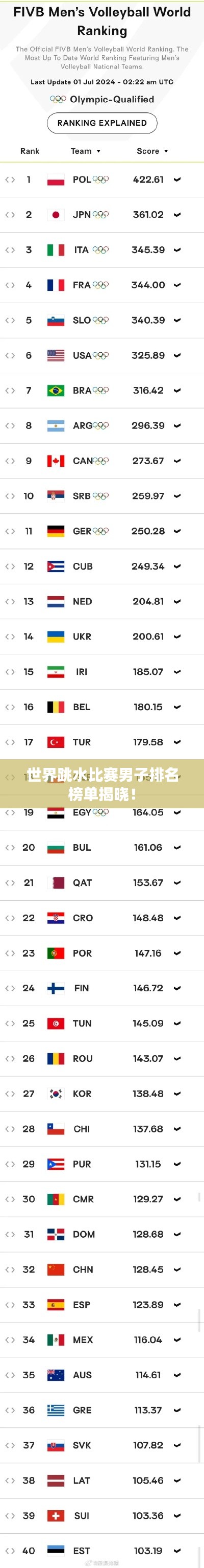 跳水运动是水上运动的一种,它结合了空中舞蹈和精确入水的元素,这项运动在全球范围内拥有广泛的观众和粉丝,特别是在中国和其他一些亚洲国家,世界跳水比赛男子排名是跳水运动员实力和技术的体现,也是全球跳水爱好者关注的焦点,本文将探讨世界跳水比赛男子排名背后的故事和运动员们的奋斗历程。