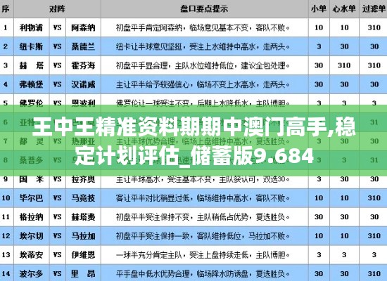 在博彩界,提及“王中王精准资料期期中澳门高手”,无疑会引起一阵瞩目,这一名号代表了极高的分析和预测能力,特别是在澳门这一竞争激烈的市场环境中,其提供的博彩数据和预测不仅精准,而且稳定。“稳定计划评估_储蓄版9.684”则是一套经过精心设计和评估的策略体系,旨在帮助玩家实现资金与风险管理的平衡。
