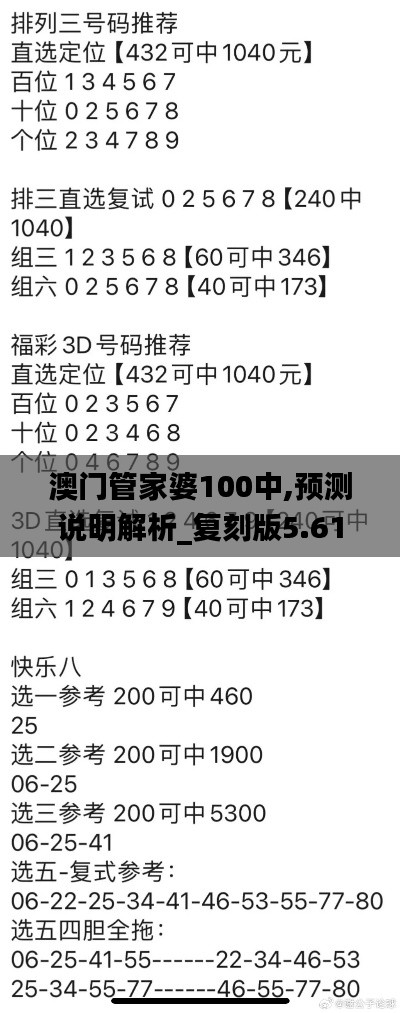 “澳门管家婆100中”这一名词可能对一些人来说较为陌生,但实际上,它源于澳门的一种彩票预测服务,该服务专门为博彩爱好者提供数字游戏的预测和解析,因其精准的预测而在博彩界拥有一定的声誉,在互联网的浪潮下,复刻版5.613应运而生,使得更多人能够方便地访问这一服务,无论身处何地都能享受澳门管家婆的预测分析。